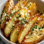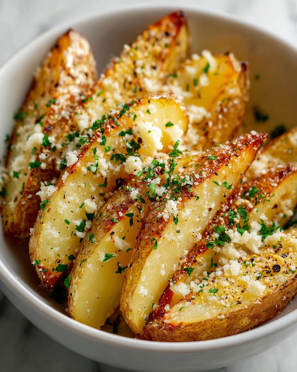 Crispy, golden baked garlic Parmesan potato wedges seasoned with Italian herbs and fresh garlic, perfect as a flavorful side dish or snack.