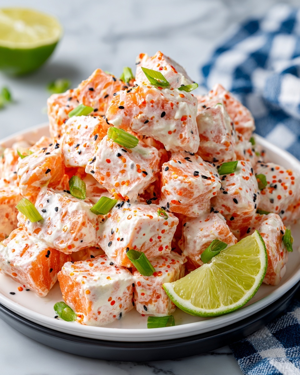 Garnishing your Bang Bang Salmon Bites Recipe not only adds a pop of color but also a fresh flavor contrast. Sprinkle chopped green onions or fresh cilantro leaves on top for a burst of herbal brightness. For a touch of crunch, sesame seeds work beautifully and make each bite look even more inviting.
