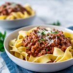 A rich and hearty Italian Beef Ragu served with wide pappardelle pasta. This slow-braised dish features tender chunks of beef cooked in a flavorful tomato and red wine sauce, enhanced with aromatic vegetables and herbs. Perfect for a comforting main course that shines with fresh parsley and Parmesan cheese on top.