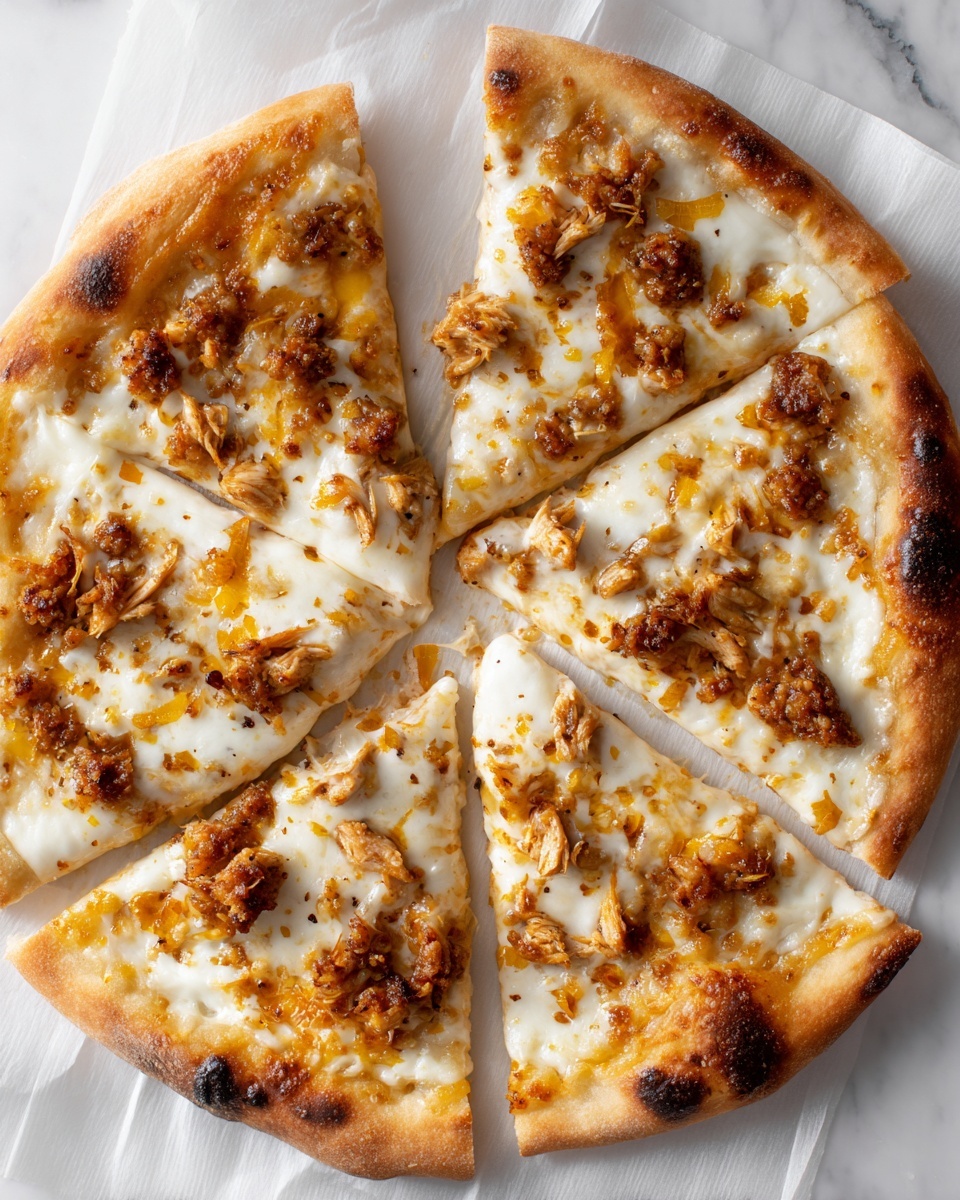Sprinkle the shredded mozzarella and Parmesan cheese over the chicken and onions. The mozzarella melts beautifully, creating that perfect stretchy texture while the Parmesan lends a subtle salty, nutty depth. Don’t be shy with the cheese—this step makes the pizza irresistible.