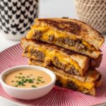 Spoon a generous amount of the cheeseburger filling onto one half of each flatbread. Then fold the flatbread over or add another one on top to create a sandwich-style pocket that holds the filling securely. Press down gently along the edges to seal it just enough so the filling stays put but don’t worry about making a perfect seal because some ooey-gooey goodness escaping is part of the fun!