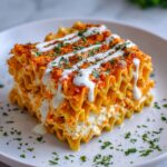 This Cheesy Buffalo Chicken Lasagna with Ranch Drizzle is a spicy and creamy twist on classic lasagna. Layers of tender lasagna noodles, shredded Buffalo chicken, rich ricotta and mozzarella blends, and creamy Alfredo sauce come together for a hearty and flavorful meal. Finished with a cool ranch drizzle and green onion garnish, this dish balances heat and creaminess perfectly and is perfect for family dinners or game day gatherings.