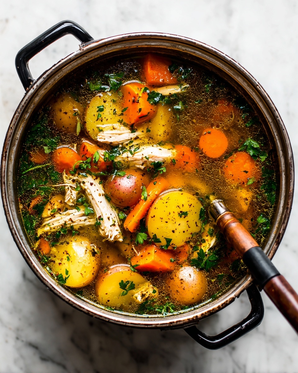 - Simmer the Stew: Return the browned chicken to the pot. Pour in the low-sodium chicken broth. Bring the mixture to a boil, then reduce heat to low. Cover and let it simmer gently for 30–35 minutes, until the chicken and vegetables are tender.