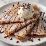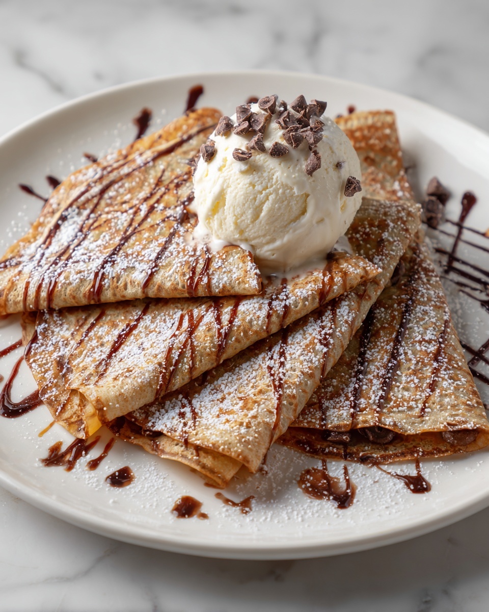 - Add Toppings: Place a scoop of vanilla ice cream on top of each folded crepe. Drizzle generously with the warm chocolate sauce.