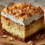 - Assemble and Top: Pour the coconut filling evenly over the cooled crust in the baking pan. Optionally, sprinkle additional shredded coconut on top for extra texture and flavor.
