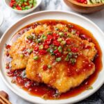 Finally, toss the crispy chicken strips into the thickened sauce and mix until every piece is glistening with the spicy-sweet coating. Remove the pan from heat, sprinkle with chopped spring onions to add freshness and contrast, then serve your masterpiece immediately, while it’s gloriously hot and crispy.