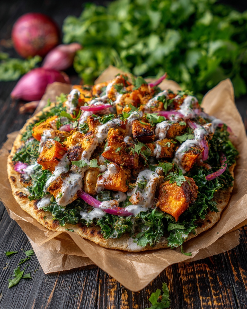 - Assemble the Gyros: Warm the naan breads. Spread a generous amount of tzatziki sauce over each piece. Layer on the cooked curry chicken, roasted sweet potatoes, and the fresh herb salad. Drizzle the toasted lemon tahini sauce over the assembled gyro and serve immediately for best flavor and texture.