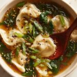 A comforting and flavorful Dumpling and Bok Choy Soup featuring savory dumplings simmered in a fragrant broth with garlic, ginger, and fresh bok choy. This easy, quick-to-make Asian-inspired soup is perfect for a nourishing weeknight meal.