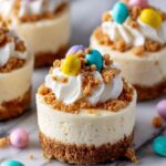 - Add toppings: Before serving, decorate each cheesecake with Easter-themed candies like mini chocolate eggs, sprinkles, or jelly beans. Optionally, add fresh berries for a pop of natural color and flavor.
