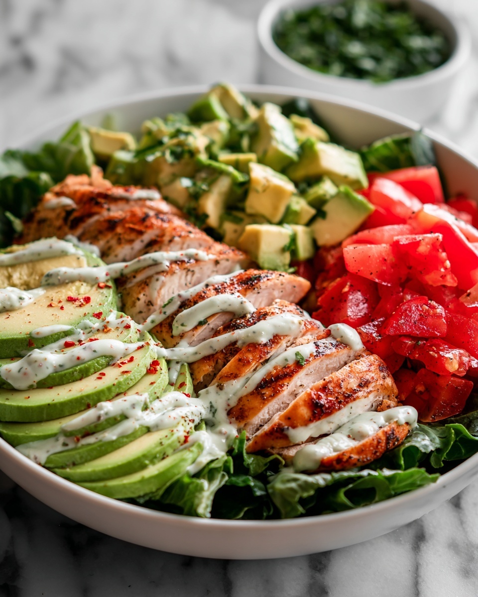 Drizzle the dressing over your tossed salad and gently toss again to coat everything evenly. Then, slice the rested grilled chicken breasts and arrange the pieces on top of the salad. Sprinkle chopped fresh cilantro over the top for an aromatic finish if you like. This final touch turns your Grilled Chicken & Avocado Salad Bowl Recipe into a stunning, ready-to-enjoy meal.