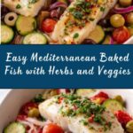 A flavorful Mediterranean baked fish recipe featuring fresh herbs, garlic, lemon, and colorful vegetables like cherry tomatoes, olives, onion, and zucchini. This easy-to-make dish combines a fragrant herb marinade with healthy olive oil and is baked to perfection, delivering a light and delicious meal in just 35 minutes.