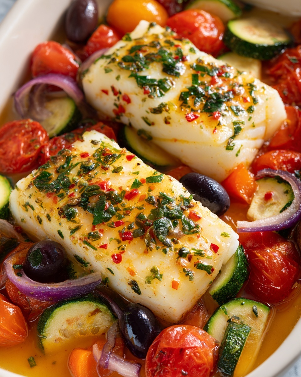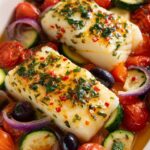 A flavorful Mediterranean baked fish recipe featuring fresh herbs, garlic, lemon, and colorful vegetables like cherry tomatoes, olives, onion, and zucchini. This easy-to-make dish combines a fragrant herb marinade with healthy olive oil and is baked to perfection, delivering a light and delicious meal in just 35 minutes.