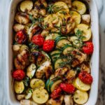A flavorful Mediterranean Chicken Zucchini Bake featuring tender chicken breasts baked with fresh zucchini, cherry tomatoes, red bell pepper, and red onion, seasoned with garlic, oregano, and thyme, then topped with fresh herbs and crumbled feta cheese. This wholesome, one-dish meal offers a perfect balance of protein and vegetables with vibrant Mediterranean flavors.
