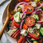 A vibrant and refreshing Mediterranean Salad loaded with chickpeas, fresh vegetables, Kalamata olives, and feta cheese, tossed in a zesty olive oil and red wine vinegar dressing. Perfect as a light meal or a flavorful side dish, ready in just 15 minutes.