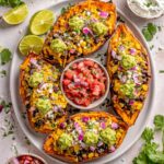 Think beyond just a plate—serve the stuffed sweet potatoes on a rustic wooden board for a cozy, homey feel. You can also halve smaller sweet potatoes and arrange them on a baking dish for a fun finger-food style presentation perfect for gatherings. For an extra pop of color, drizzle a chipotle-lime crema or sprinkle some crushed red pepper flakes to add a bit of kick.
