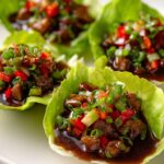 Garnishes add personality and texture to your Thai Chicken Lettuce Wraps Recipe. Fresh lime wedges are perfect for squeezing over each wrap, adding a zesty punch. Extra chopped cilantro and sliced green onions sprinkled on top enhance the fresh herbal aroma. And don’t forget the peanuts for that satisfying crunch that complements the tender chicken filling.