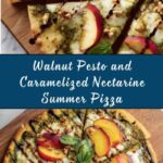 This toasted walnut pesto and caramelized nectarine pizza combines sweet and savory elements with bold flavors and an artisanal flair. Featuring a crispy pizza crust topped with nutty walnut pesto, juicy caramelized nectarines, creamy mozzarella and goat cheese, all finished with a spicy balsamic reduction, this summer-inspired pizza is perfect for sharing and impressing guests.