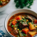 A comforting and hearty vegetable beef soup featuring tender stew meat, a medley of fresh vegetables, and robust beef broth. Perfect as a warming meal, this classic American recipe is gluten-free and ideal for family dinners or meal prepping.